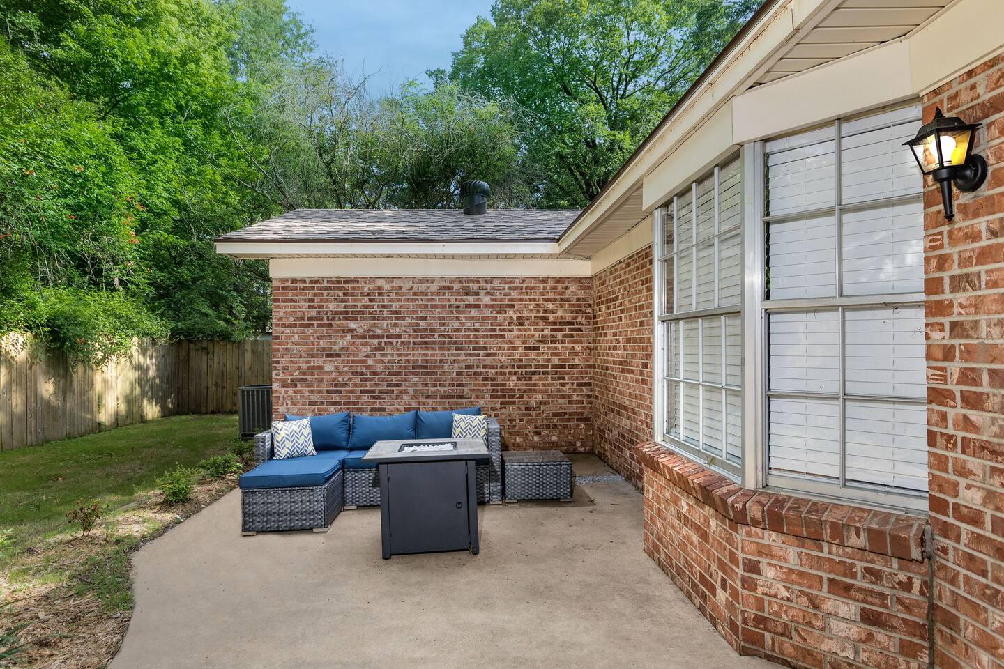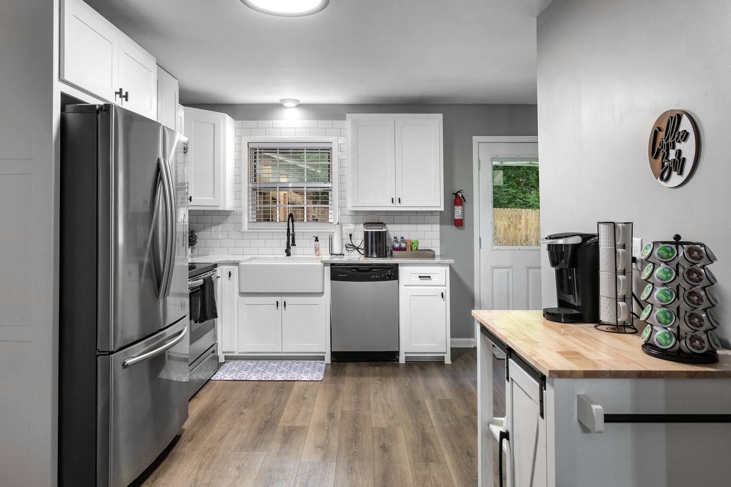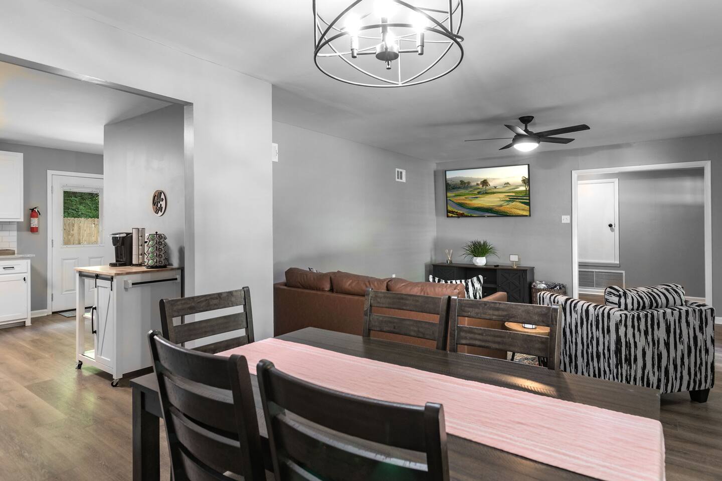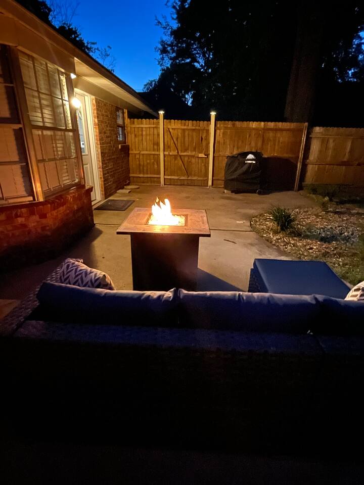 The living room has a 65inch Roku tv and comfortable seating to make you feel at home! There is a large dining table so the whole family can sit down for a meal. The kitchen is stocked with basic utensils, pots, pans, skillets and spices so making a meal is an easy task! Out the back door there is a sitting couch along with a fire pit and grill so you can enjoy your evening outside!