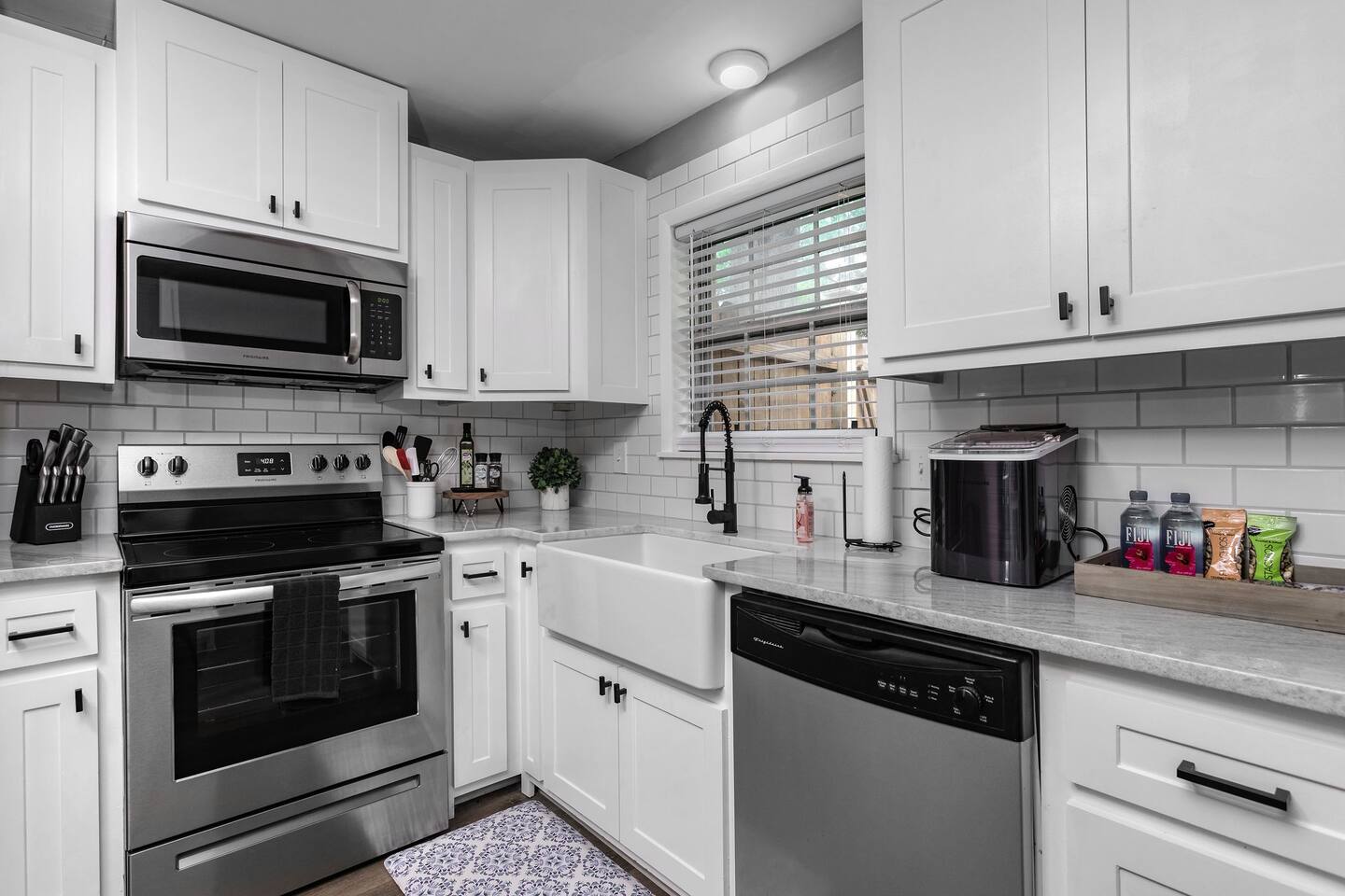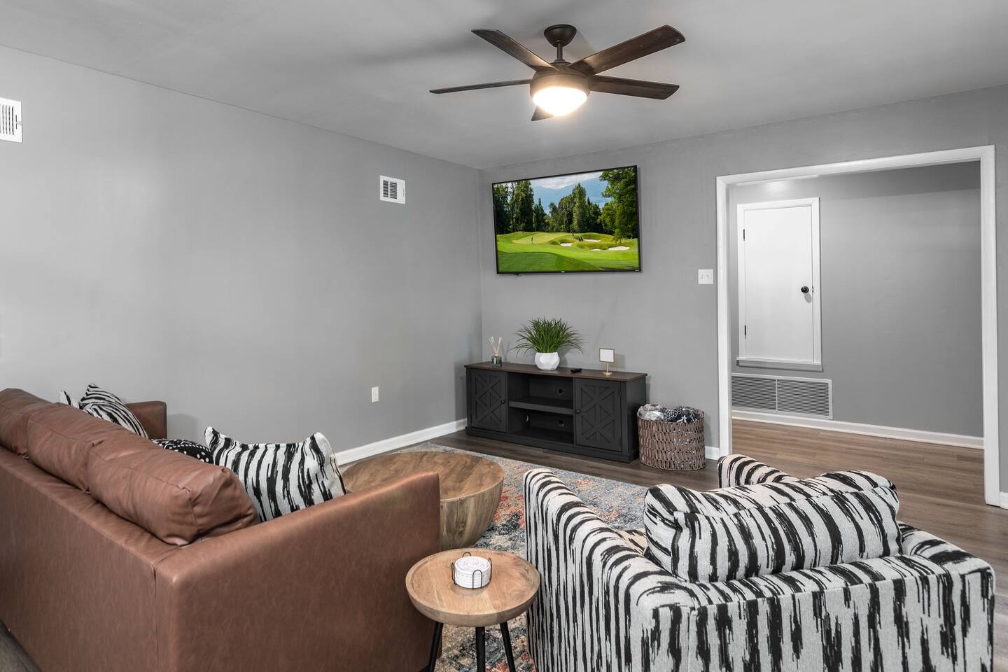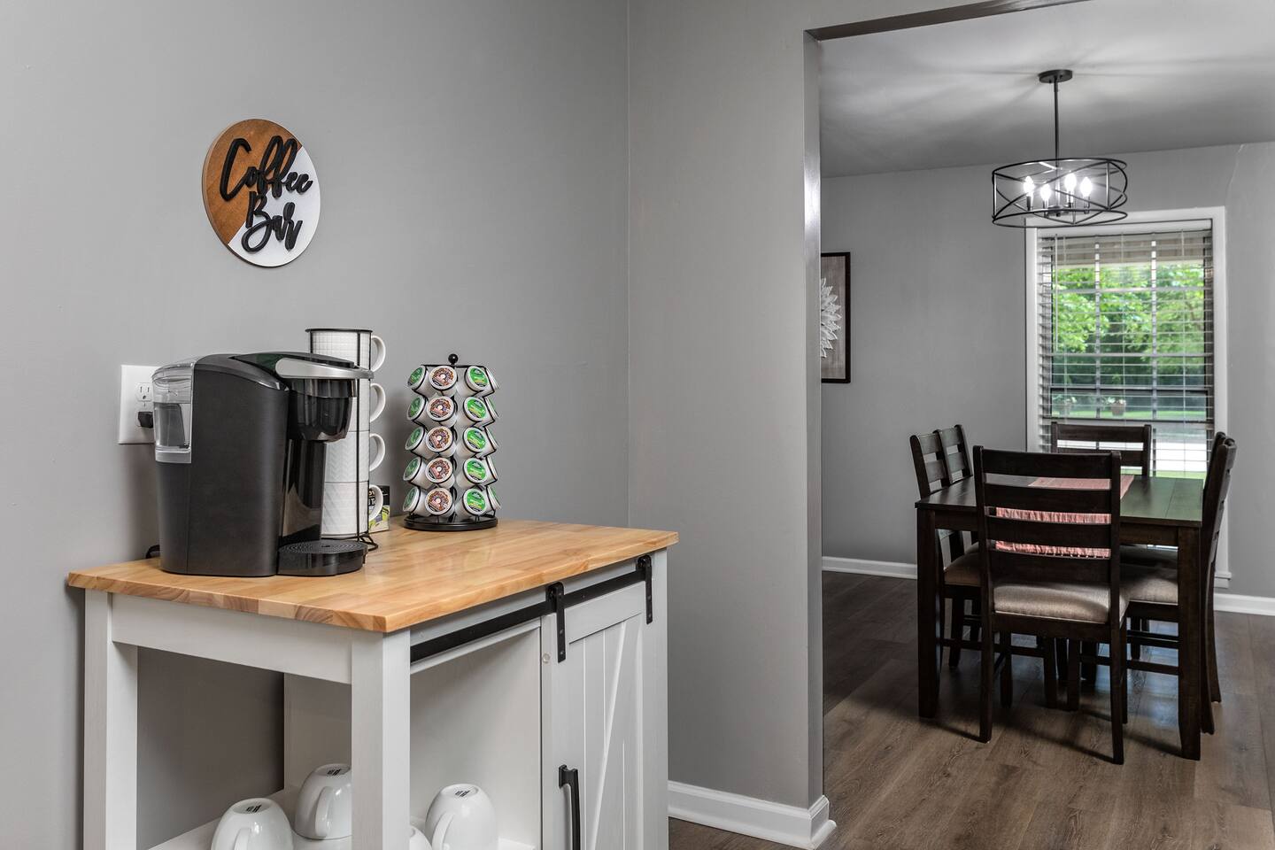The living room has a 65inch Roku tv and comfortable seating to make you feel at home! There is a large dining table so the whole family can sit down for a meal. The kitchen is stocked with basic utensils, pots, pans, skillets and spices so making a meal is an easy task! Out the back door there is a sitting couch along with a fire pit and grill so you can enjoy your evening outside!